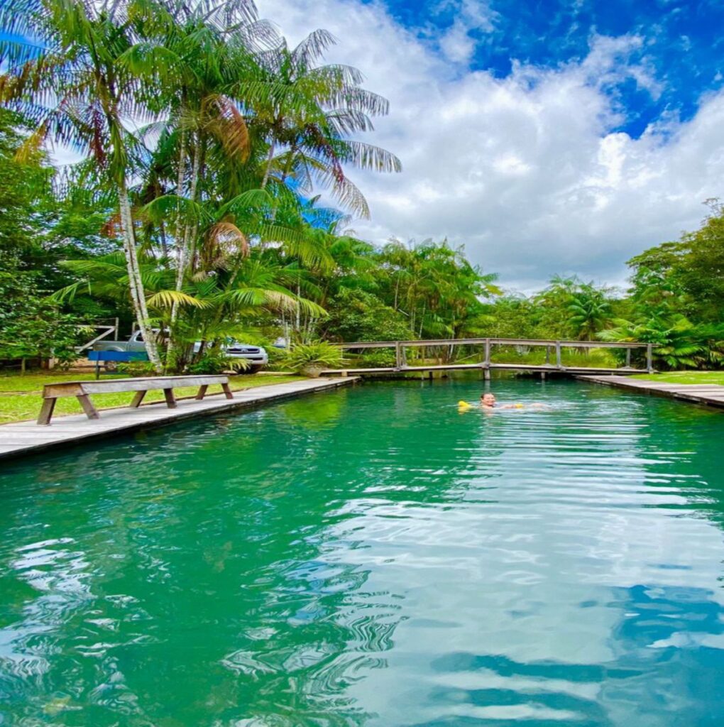 APRESENTAÇÃO: Belo lugar, de água bastante gelada para passar um dia de lazer com a família e amigos. Possui restaurante com vários pratos, além de bebidas e sucos nos quiosques em volta do igarapé. Piscina natural com uma passarela de madeira em formato de violão e redário.